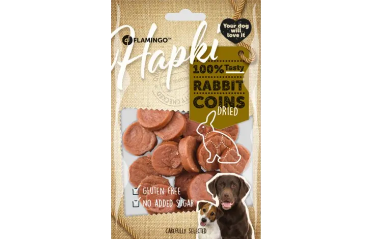 De Hapki Coins met Konijn zijn heerlijke, dunne hondensnacks die perfect zijn als beloning tussendoor of tijdens trainingen. Deze snack is gemaakt met konijn als dierlijke eiwitbron en is daardoor zeer geschikt voor honden met voedingsintoleranties of allergieën.