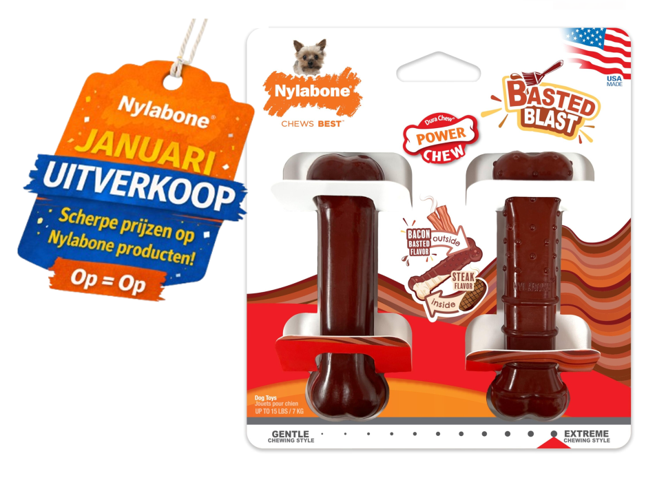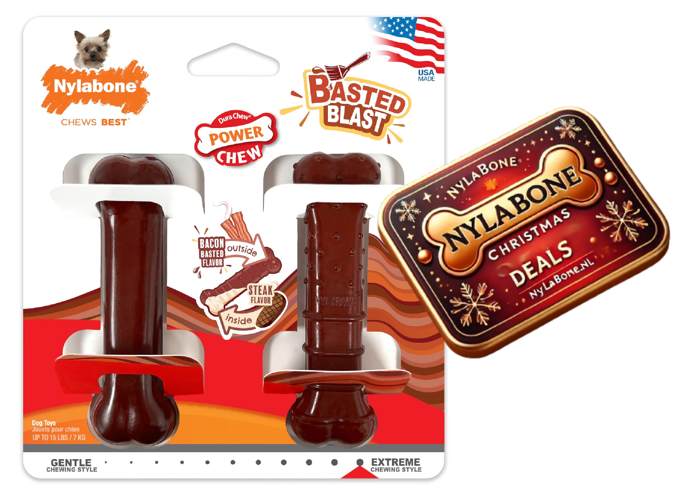 Geef je hond een onweerstaanbaar kauwplezier met de Nylabone Extreme Chew Basted Blast! Dankzij onze innovatieve braadtechniek combineert dit bot twee heerlijke smaken: een smaakvolle bacon laag aan de buitenkant en een verrukkelijke steaksmaak aan de binnenkant.