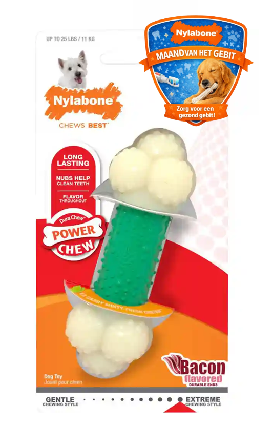 De harde nylon uiteinden zijn ontworpen om langdurig kauwplezier te bieden en helpen actief bij het verminderen van tandplak en tandsteen. De iets zachtere rubberen kern, verrijkt met bacon- en muntsmaak, zorgt voor extra aantrekkingskracht én draagt bij aan een frisse adem. Dankzij deze dubbele werking blijft jouw hond langer geïnteresseerd, terwijl zijn gebit optimaal wordt verzorgd.