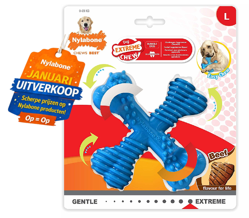 Kies voor kwaliteit, duurzaamheid en veiligheid. Kies voor Nylabone Extreme Chew Power Chew X Bone Large – het ultieme kauwspeeltje dat wél heel blijft.
