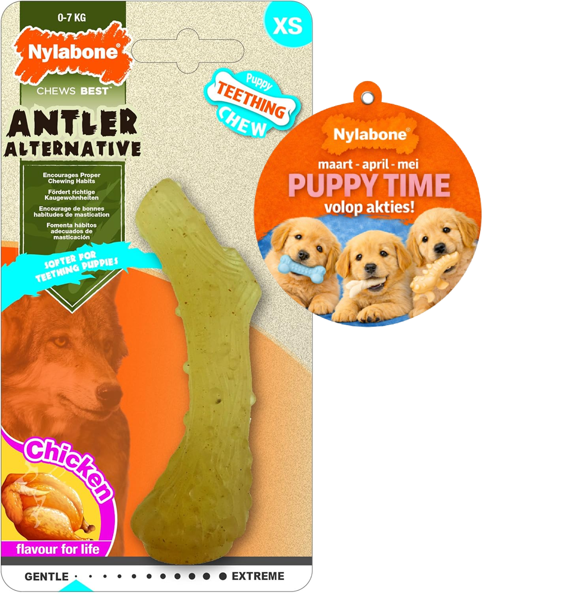 Het zachte maar sterke nylon materiaal is vriendelijk voor het gevoelige puppygebit. Dankzij de subtiele, door-en-door verwerkte kipsmaak blijft je pup langdurig geïnteresseerd, zonder calorieën binnen te krijgen.