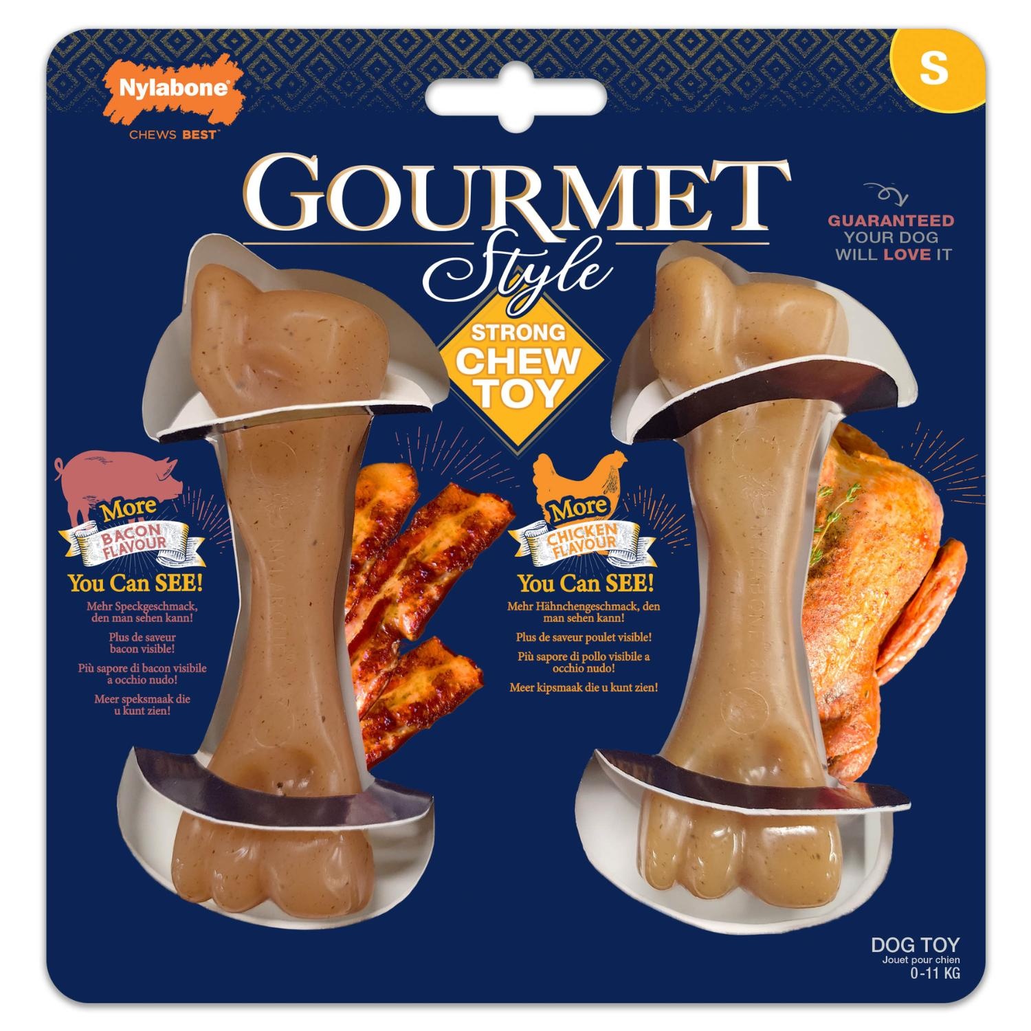 De Nylabone Gourmet Femur Twin Pack Chicken & Bacon is speciaal ontwikkeld voor kleine honden tot 11 kg die dol zijn op smaakvol kauwen. Deze duurzame kauwbotten zijn gemaakt van sterk nylon en bevatten zichtbare smaakstukjes met heerlijke kip- en baconsmaak, waardoor zelfs kieskeurige honden enthousiast blijven kauwen.