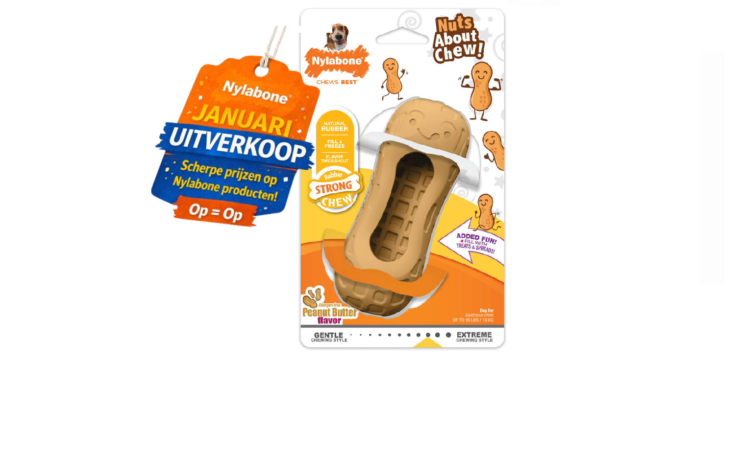 Unieke pinda-vorm met een “fill/spread” gedeelte — smeer er pindakaas of een andere spread in en maak de kauwsessie extra aantrekkelijk.